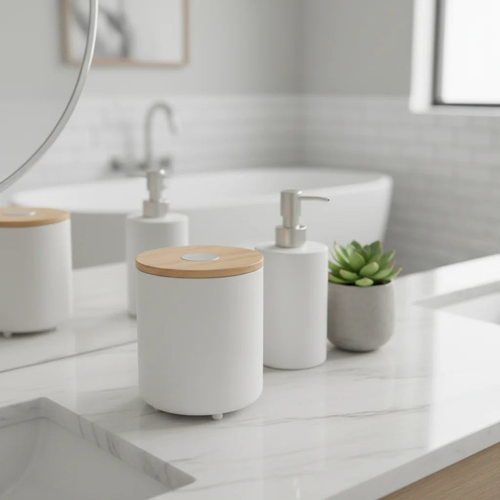 Ditch the eyesore. Its sleek white finish and elegant wood-grain lid instantly elevate your desk, vanity, or countertop.