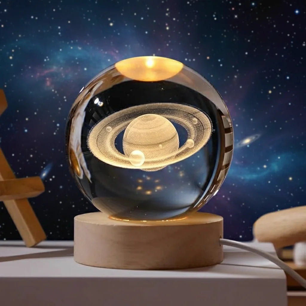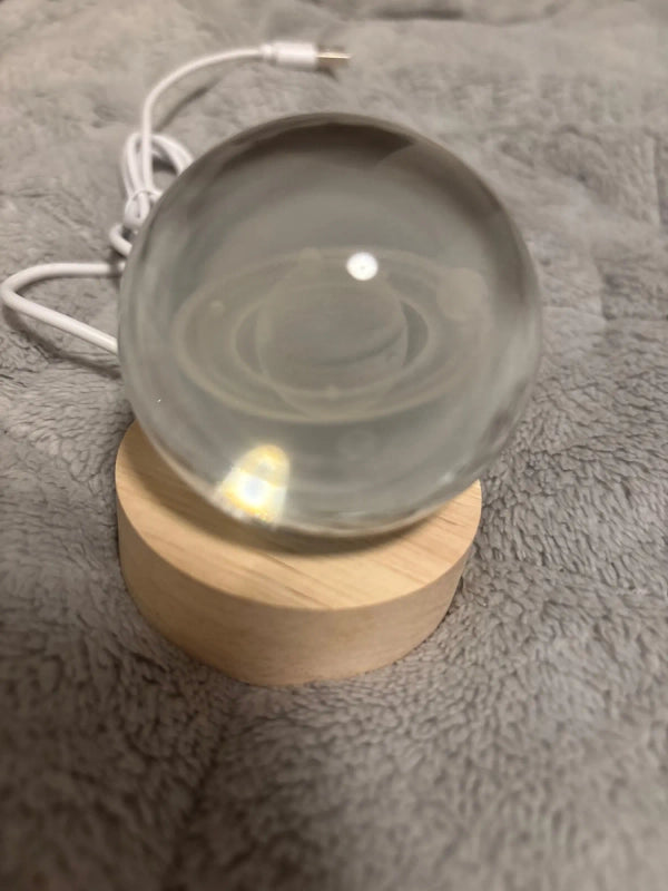 Inside the clear crystal sphere, a warm yellow LED light illuminates the detailed 3D planet, bringing the cosmos to life with a captivating and soothing radiance.